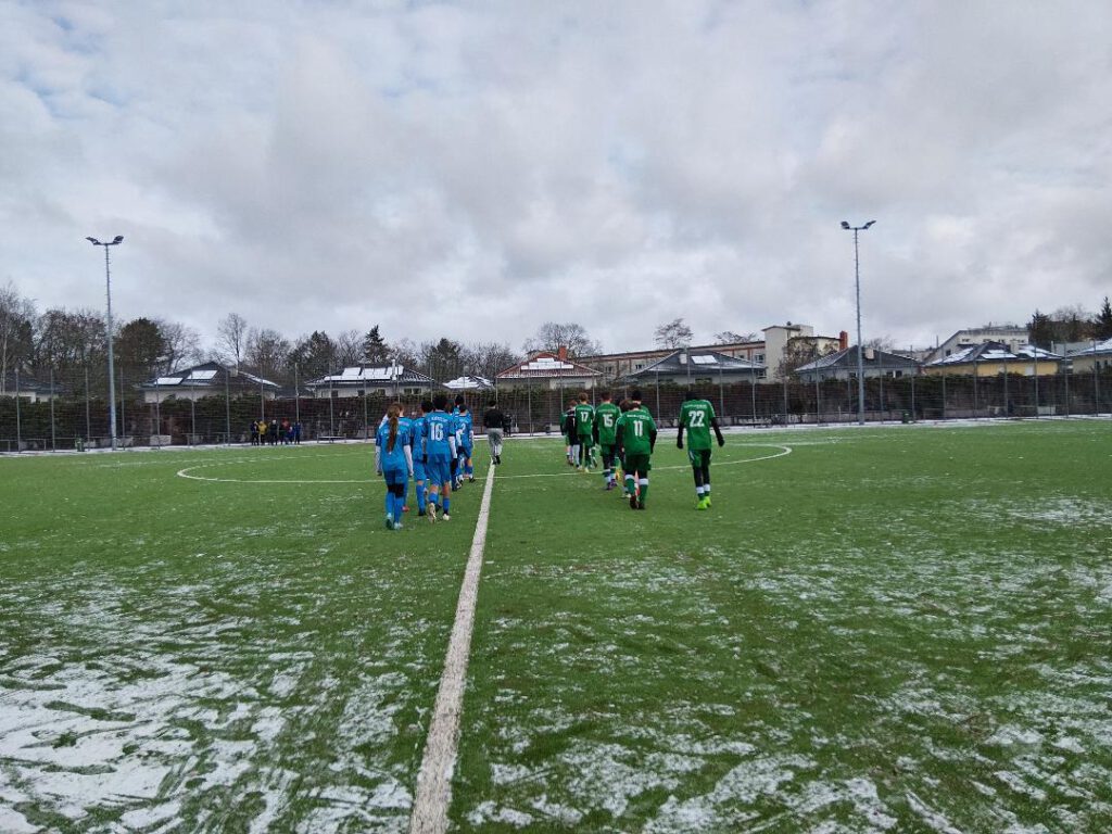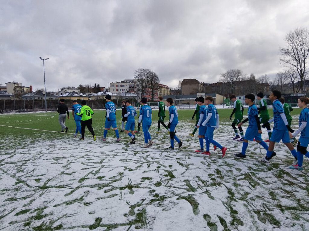 7. Januar. Drei Mal 25 Minuten heute gegen das Landesklassen-Team des VfB Einheit zu Pankow. Fazit: 50 Minuten lang hielten wir auf hartem, leicht verschneiten Boden gut mit, verteidigten stark und mit Leidenschaft (den Rest kratzte der Torhüter weg) – und setzten immer wieder gefährliche Konter. Es stand 2:3. Das ging auch halbwegs in Ordnung. Pankow vergab einige Chancen, wir hatten aber auch noch unsere Dinger… Dann das letzte Drittel als Ausreißer. 0:5. Vielleicht erklärbar – aber nicht so wirklich entschuldbar. Denn es wurde nicht mehr mit letzter Konsequenz um jeden Ball gefightet, haarsträubende individuelle Fehler kamen hinzu. Sehr ärgerlich, weil es den Gesamteindruck doch sehr in Mitleidenschaft zog. 2:8 am Ende. Irgendwie unnötig. Sichtbar war, dass nach erst einer Trainingseinheit im neuen Jahr (gestern in der Halle, mit starken Konditionselementen) noch an einigem mangelt. Siemensstadt heute: Anil, Amin – Artjom, Louisa, Tammo, Said, Adil, Eric, Sabur, Abbas, Alex M., Alex B., Lorijon.